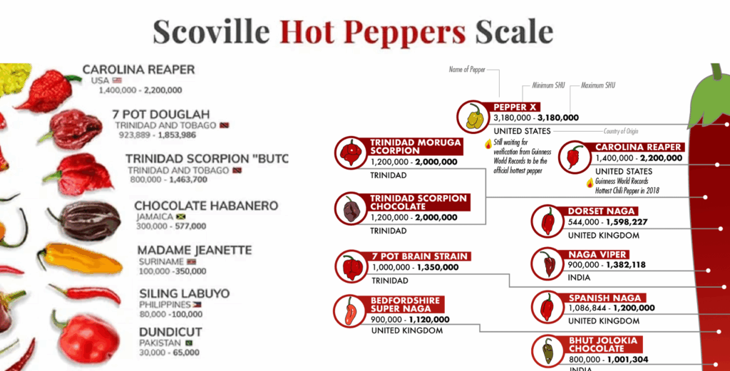 • Extreme/Superhots (500,000 – 2,000,000+ SHU): Ghost Pepper (~1,000,000+), Trinidad Scorpion (~1,200,000 – 2,000,000), Carolina Reaper (~1,500,000 – 2,200,000), and the new champion…